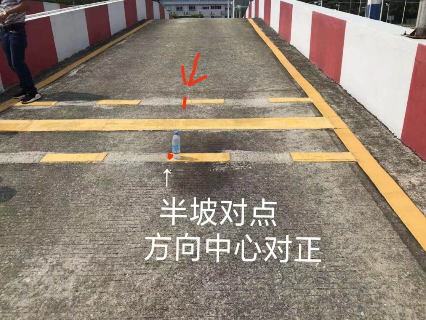 人、方向盘中心与前方点位(练习场是砖头,考场是右起第二条白线中点)连成一线。