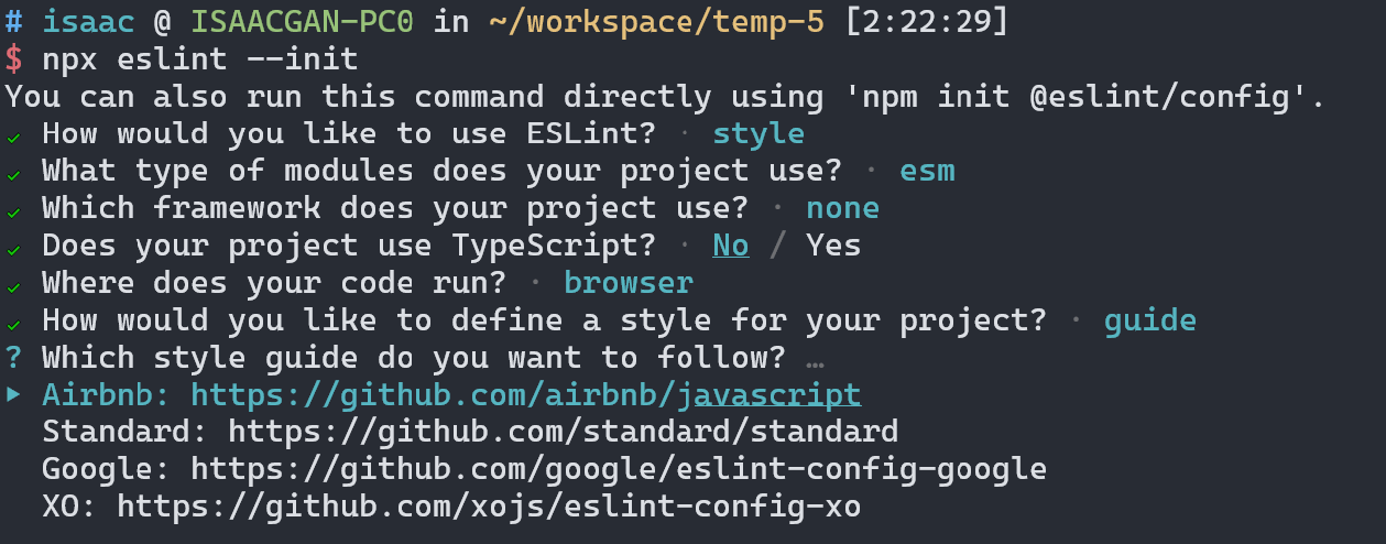在初始化过程中,需要我们选择 Eslint 代码风格。在 Prompt 中可以看到有 Airbnb、Standard,Google 和 XO 四种提供。下面以表格的形式对四种规范做简短说明。