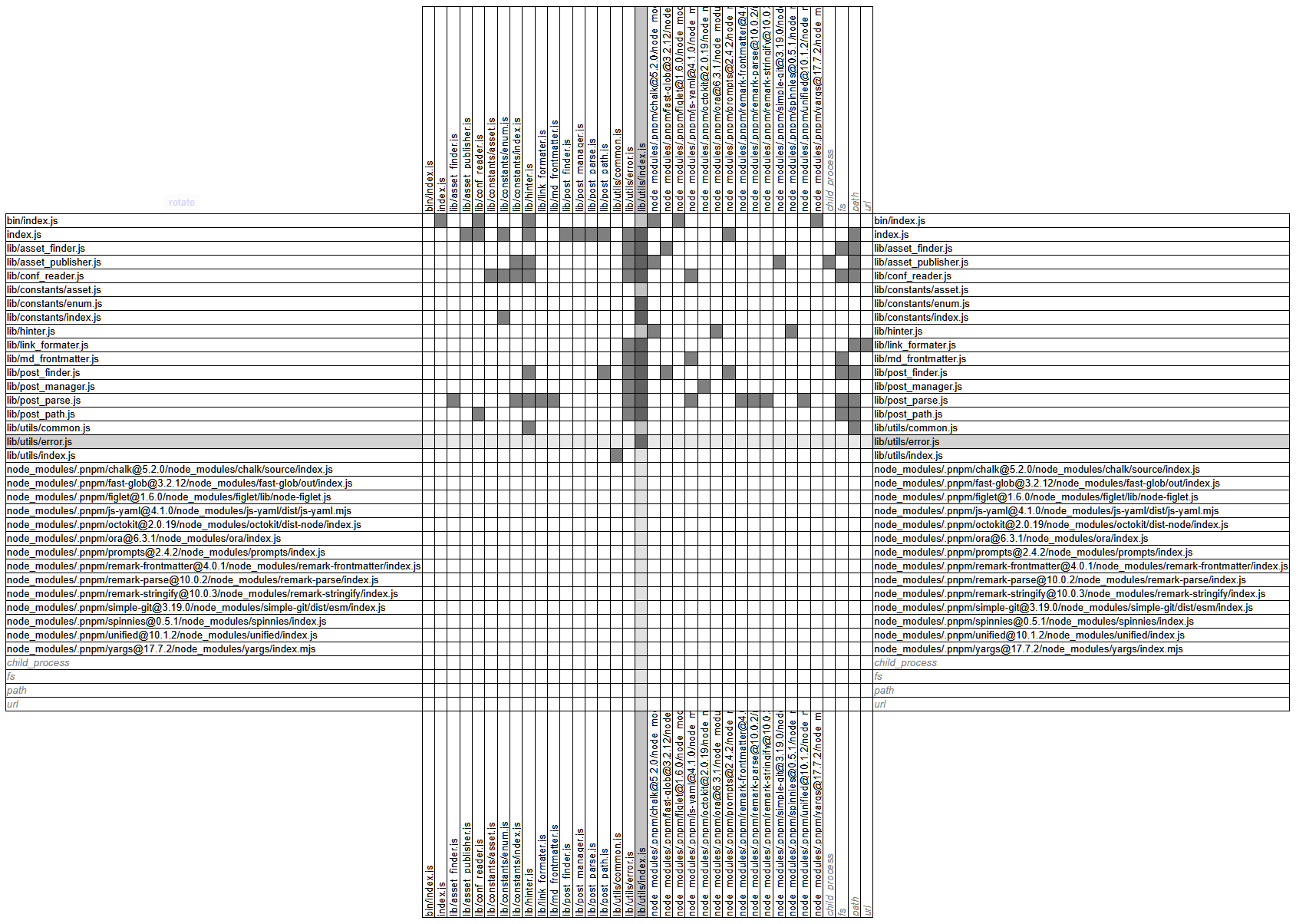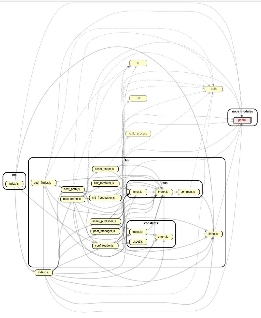 上面做了 Dependency cruiser 的实践。生成报告前需要初始化配置文件。实践了 3 种报告,其中 2 种需要依赖系统软件 graphviz,1 种不需要。前 2 种类似,区别在于可交互性(可高亮模块的引入路线),相较后面 1 种可读性强。