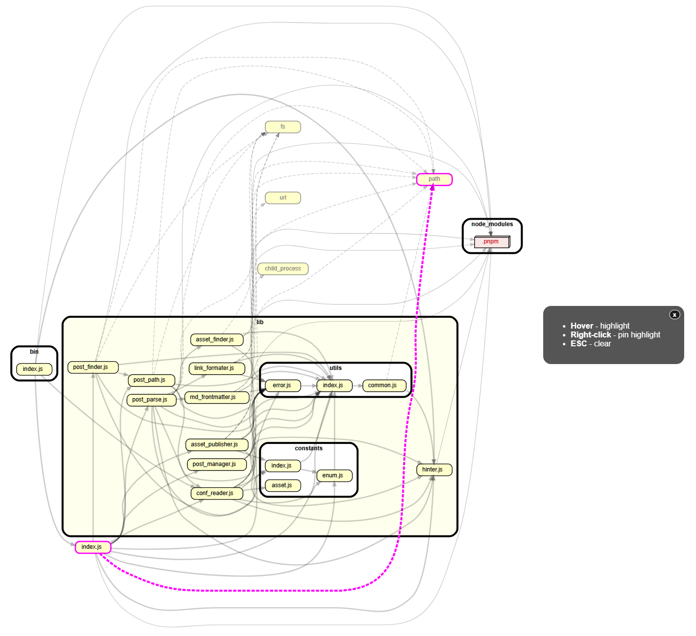 Dependency-Cruiser 单纯提供依赖关系信息,支持多种样式报告,但多依赖系统软件。它生成的报告,在模块依赖关系的信息方面比起 Rollup Plugin Visualizer 更强。