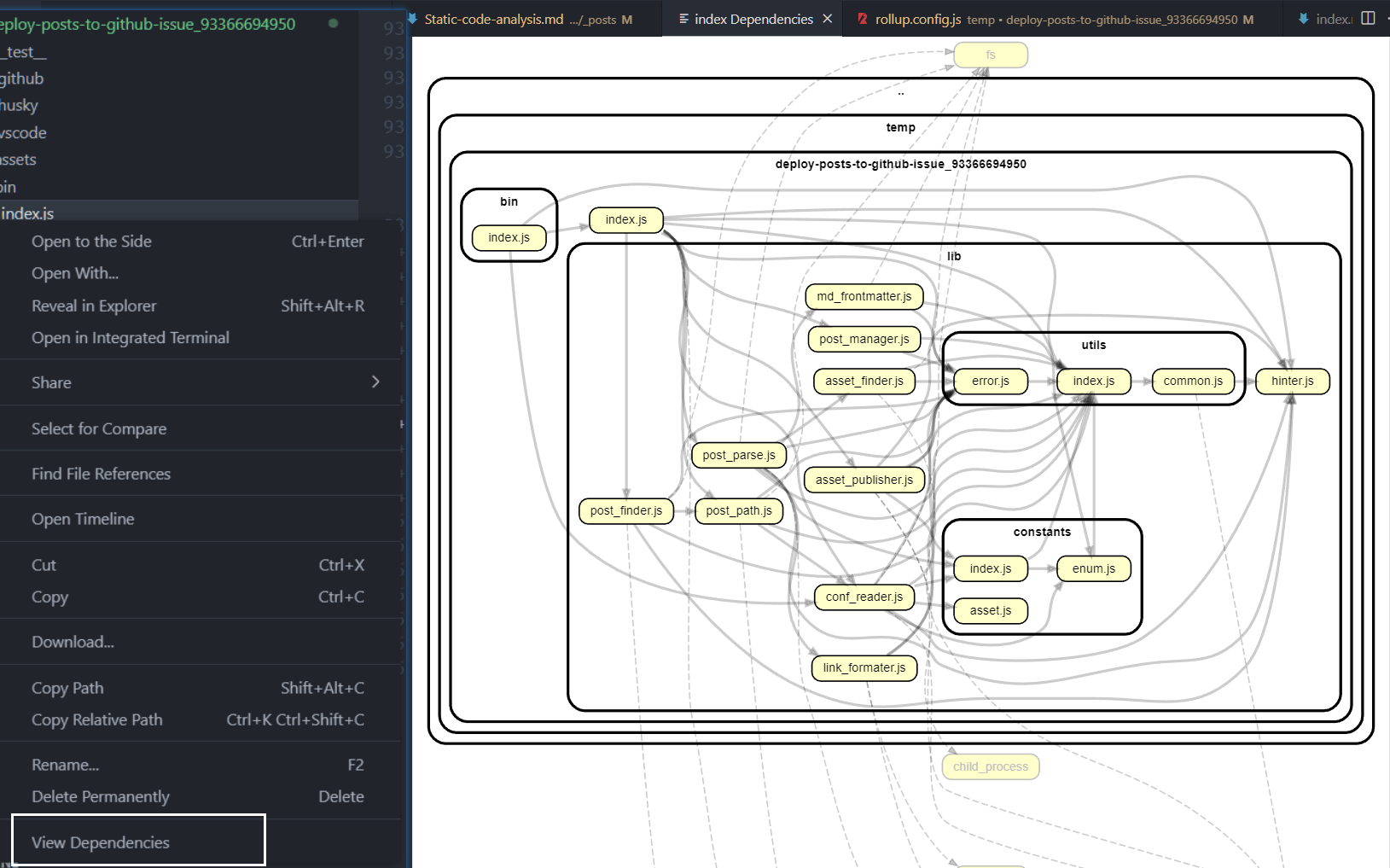 Dependency cruiser 除了支持 CLI 单独生成依赖报告外,还支持集成到 IDE(VS Code),可以查阅单个模块的依赖上下文,生成的报告支持在 VS CODE 跳转到相应模块文件。