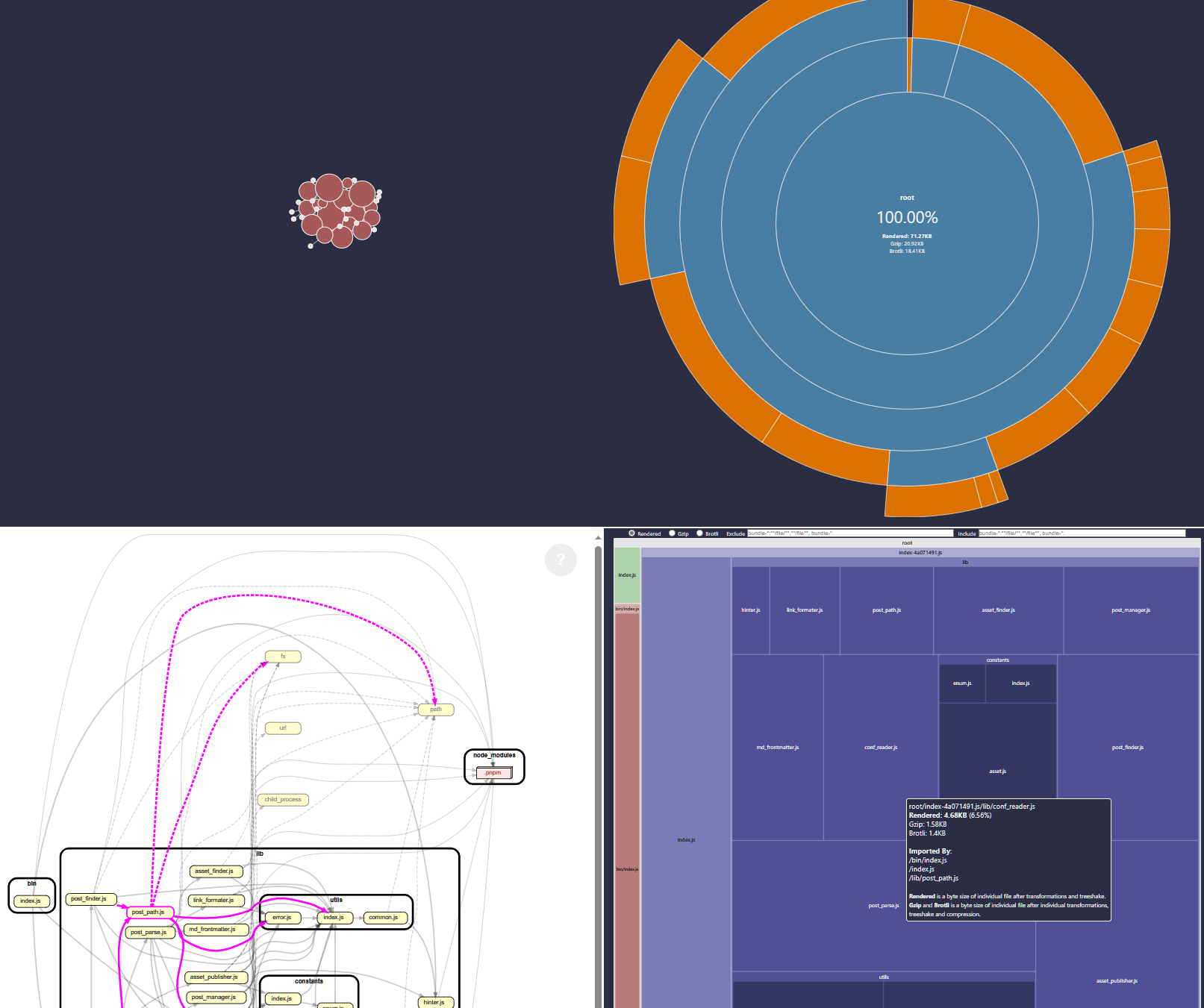 Rollup Plugin Visualizer 是 rollup 常见,需要配置 rollup 的打包流程使用。它支持 Sunburst Chart、Treemap Chart 和 Network Graph 3 种可视化报告,除了依赖关系信息外,还提供压缩与原始的模块大小信息。